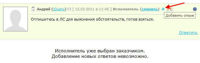 Работодателя также могут оставить отзыв фрилансеру, выбранного исполнителем заказа, со страницы своего заказа, кликнув по иконке с изображением плюса: