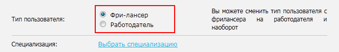 Примечание: Для PRO-аккаунтов смена типа аккаунта недоступна. У данного типа аккаунта есть все возможности и аккаунта фрилансера, и работодателя (как отвечать на заказы, так и добавлять новые).