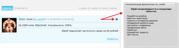Специализация фрилансера будет отображаться на странице его профиля, а также на странице заказа, на который он ответил: