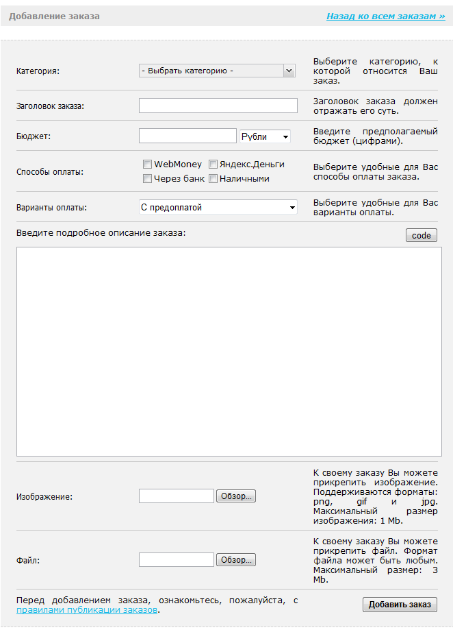 Страница добавления заказа доступна только для работодателей и для PRO-аккаунтов. Если у Вас обычный аккаунт фрилансера, и Вы хотите добавить заказ, то Вы можете временно сменить группу на «Работодатель» в настройках аккаунта.